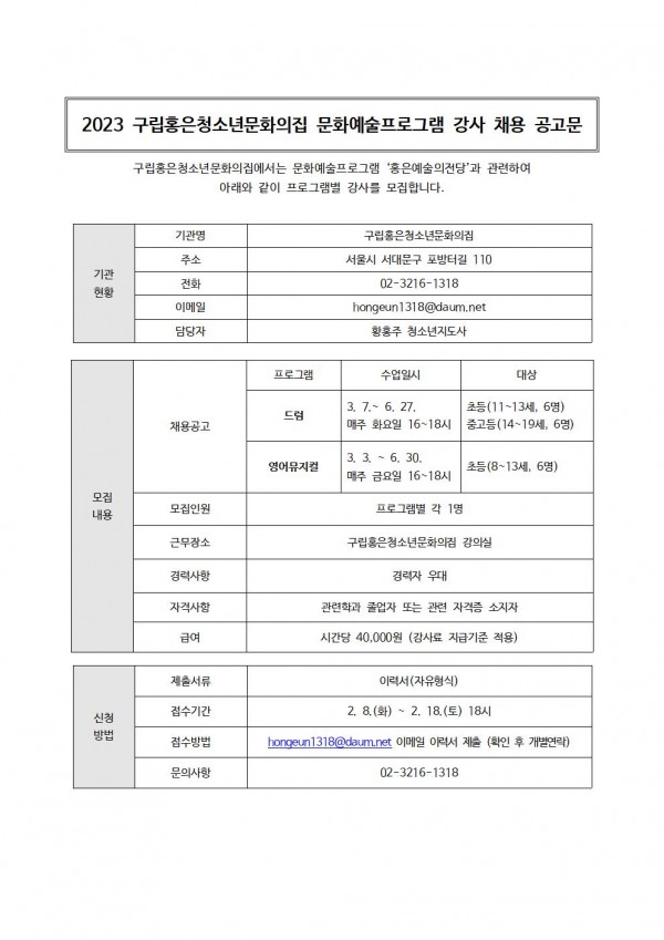 | ㆍ모집직종 | 뮤지컬강사 | 영어뮤지컬강사 |